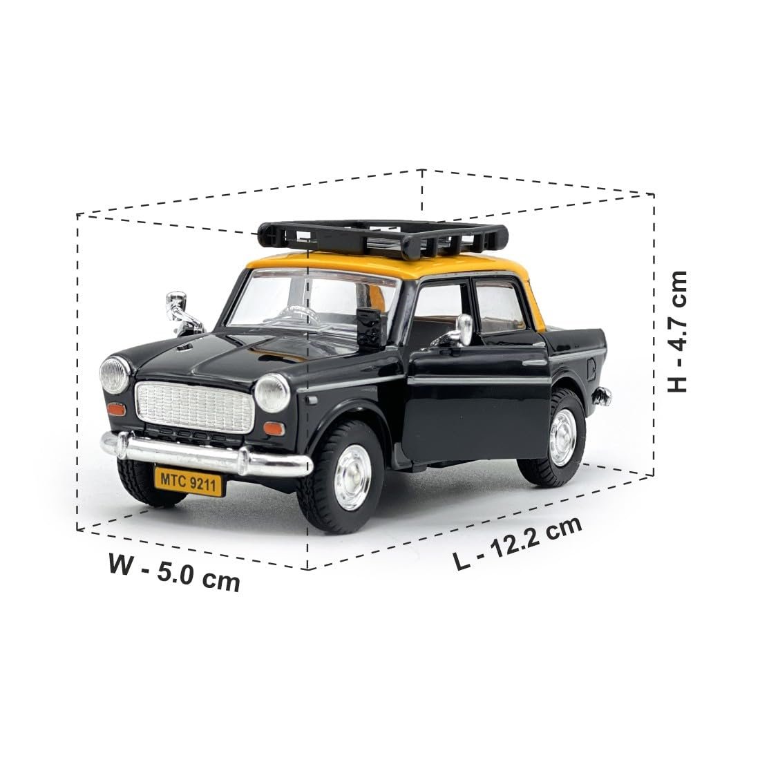 - Iconic Taxi Design: Authentic replica of the Kali Peeli Mumbai Taxi (Queen 70 S), complete with a yellow roof and roof rack detail.