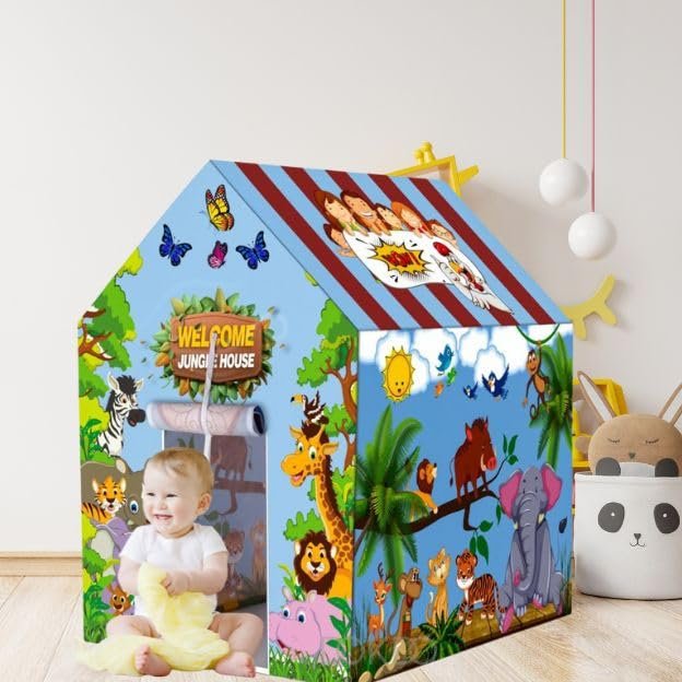 The Kids Play Tent House is a spacious and vibrant toy house featuring a fun Jungle Safari theme, perfect for sparking the imagination of boys and girls. This foldable tent house offers a dedicated, creative space for children aged 2 to 8 years to play, read, or simply have a cosy retreat. Its multiple uses allow it to serve as an indoor toy house or an outdoor kids play tent, making it a highly versatile and portable option. The pop-up design ensures it is easy to set up quickly and without tools, guaranteeing hassle-free fun. Constructed with high-quality, non-toxic materials (Plastic, PVC), this playhouse is safe and durable, offering a secure environment for group play—roomy enough for multiple children to enjoy sleepovers and social games. This is a great, engaging gift that encourages active and imaginative play (E.E.A.T. demonstrated through clear safety features, material focus, and imaginative play purpose).