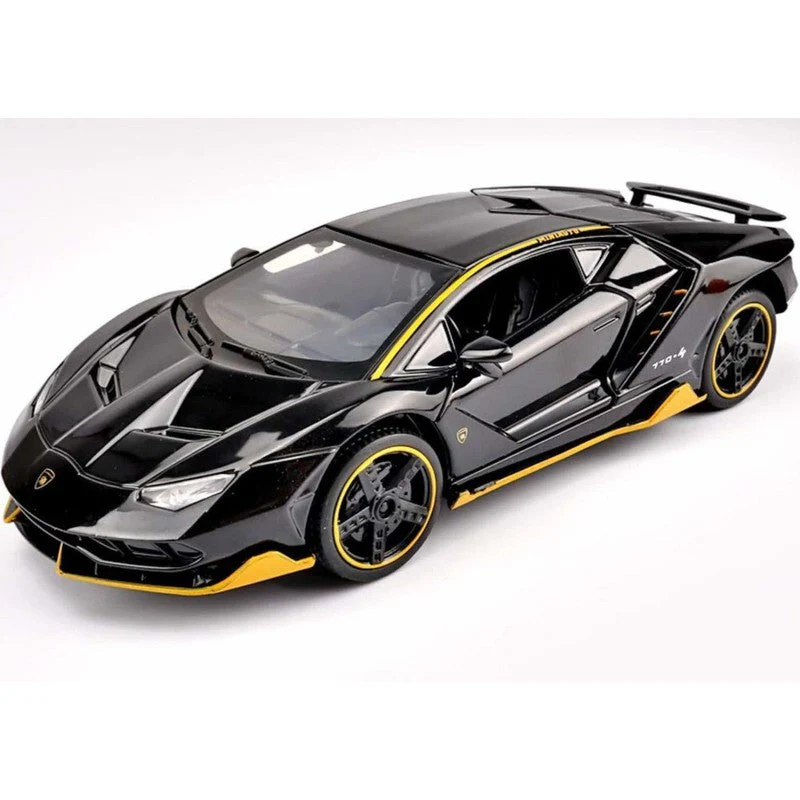 Experience premium craftsmanship with this 1:32 scale die-cast model car! The 1/32 Lamborghini Centenario (known internally as the 770-4) is a Premium die-cast scale model by Itsytoys. Crafted with realistic detailing that captures the aggressive, limited-edition design of the hypercar, this model is a true miniature masterpiece. Finished in a stunning black with vibrant yellow accents and wheels, it is a magnificent piece for any display. With a durable build from premium die-cast material, it is perfect for both display or gifting. This replica brings the excitement of the Lamborghini Centenario into your home and is a must-have collectible for car enthusiasts. Ideal for gifting, showcasing, or adding to your die-cast car collection.