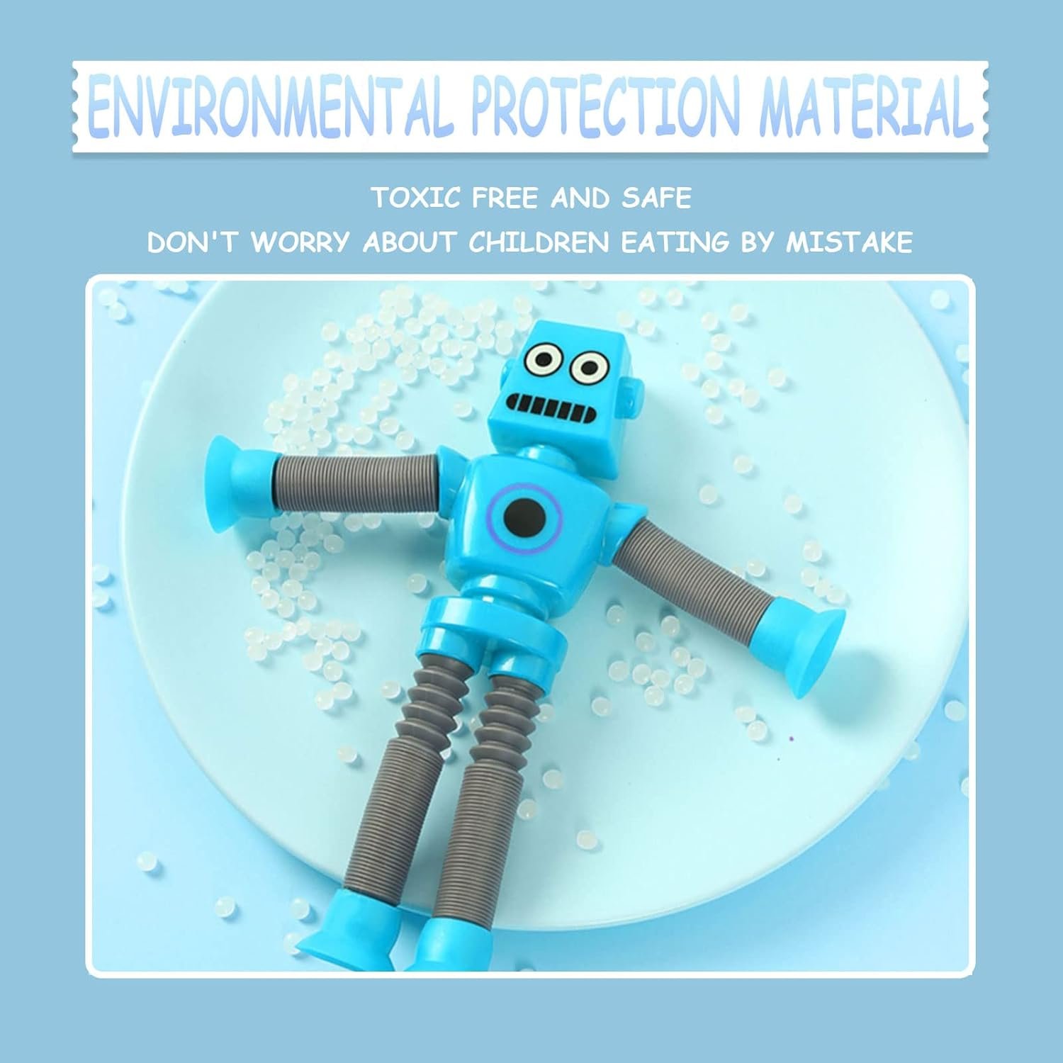 • The unique robot design adds an engaging, imaginative play element beyond simple stretching and popping.